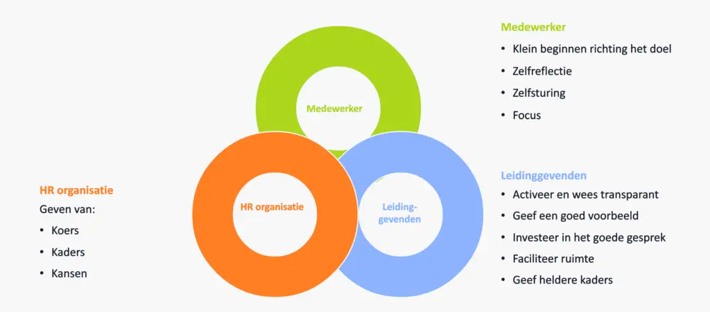 Als je de rol van de (HR-)organisatie onder de loep neemt, zie je verschillende knoppen waar jij als professional aan kunt draaien: De koers helpt medewerkers te zien welke mogelijkheden en richtingen er binnen de organisatie zijn. Kaders bieden structuur, duidelijkheid en ondersteuning, zodat medewerkers hun ontwikkelstappen effectief kunnen zetten. Kansen creëren ruimte om vaardigheden te ontwikkelen, ervaring op te doen en nieuwe rollen te verkennen.